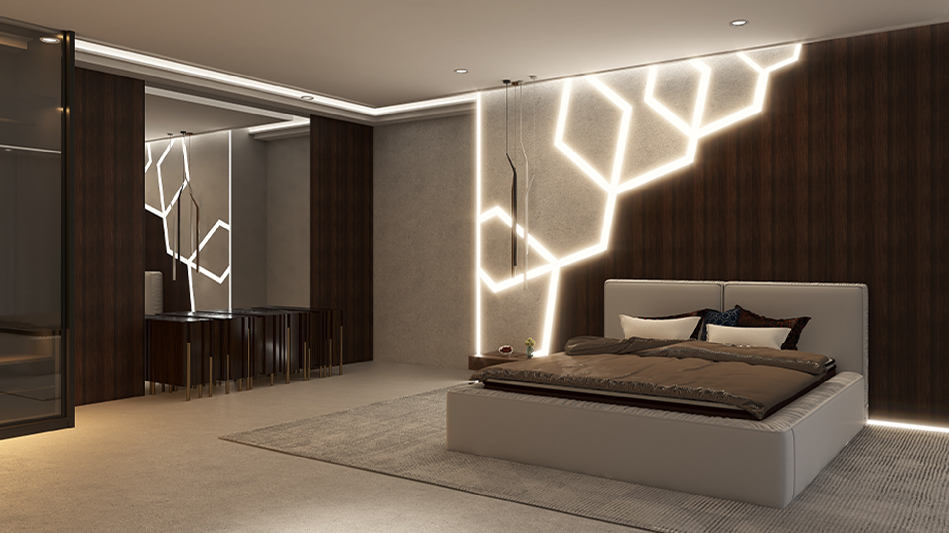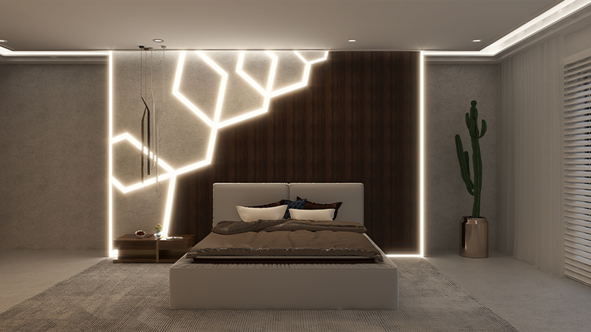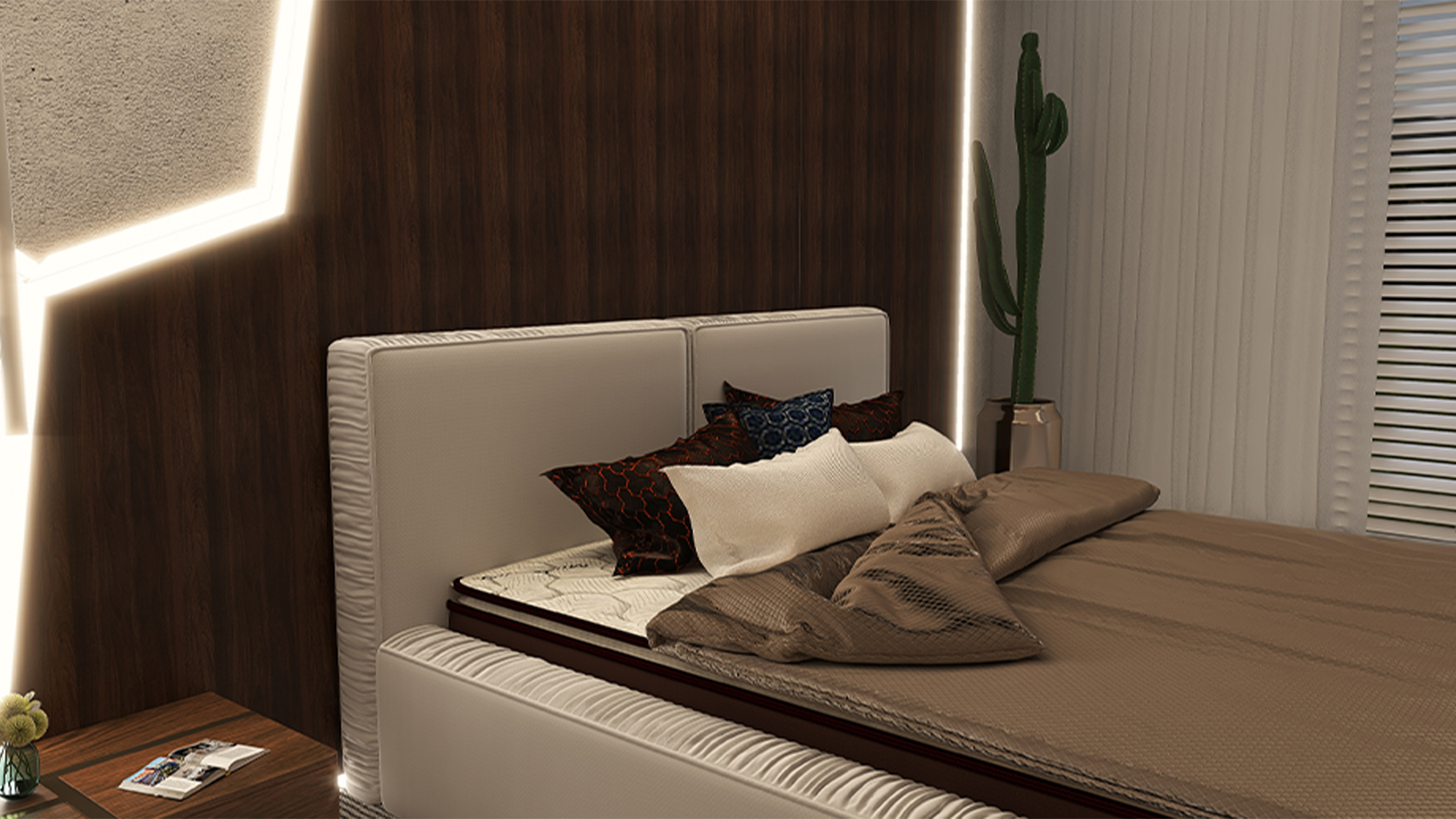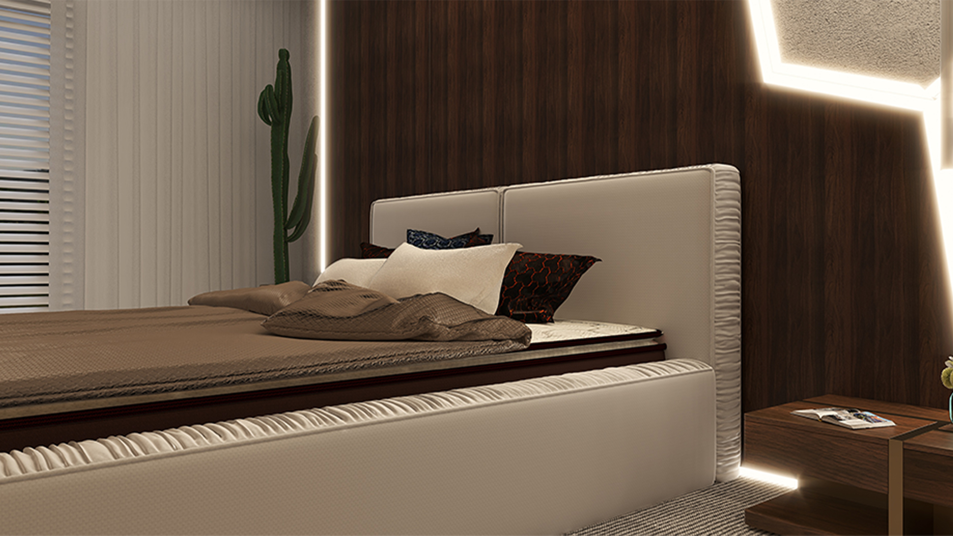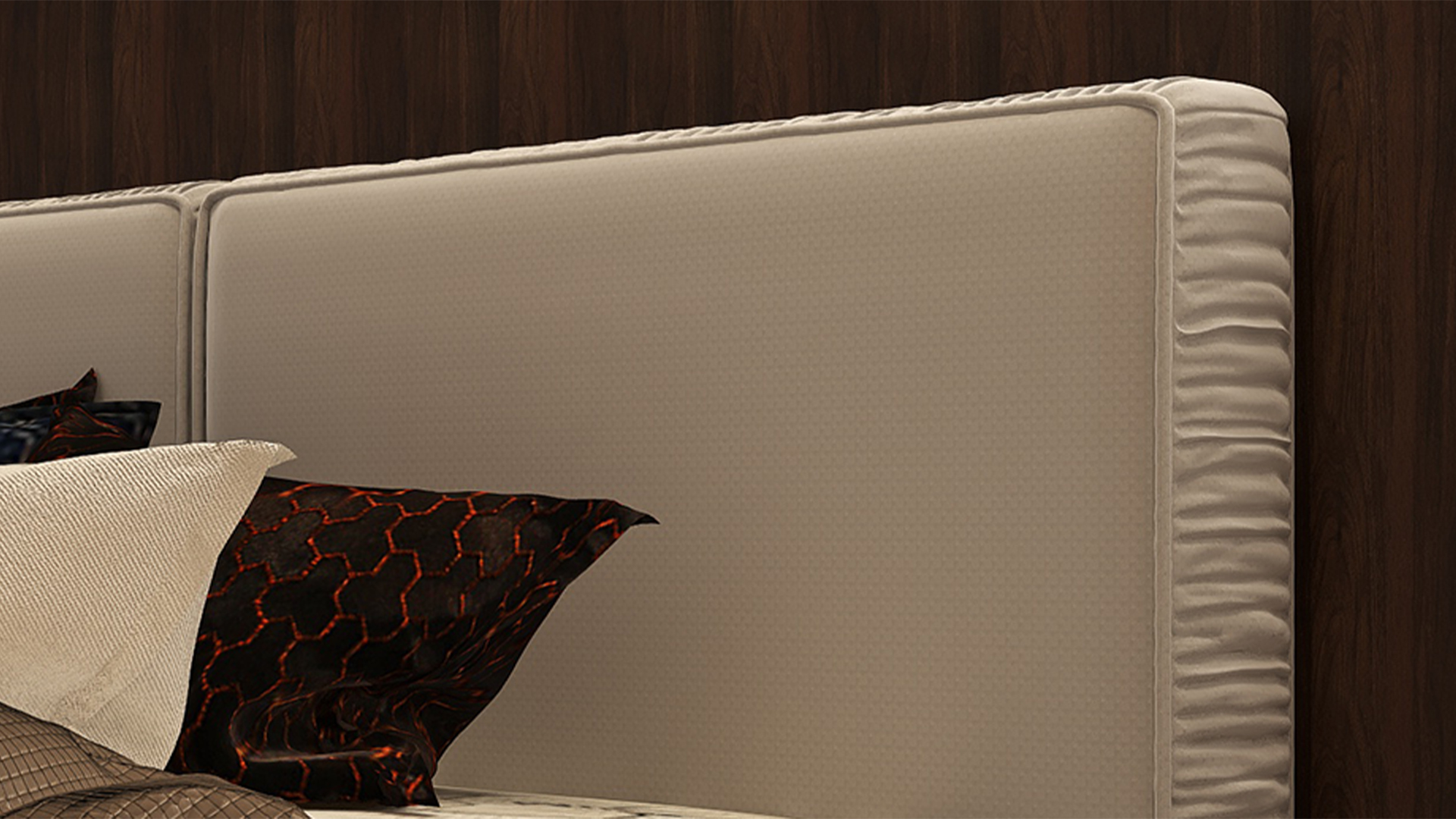 Nowoczesne łóżko z niską ramą i wysokim dwudzielnym wezgłowiem. Zaprojektowane z dbałością o detale wykończeniowe. Jego krawędzie zostały ozdobione marszczeniem tworzącym estetyczne obramowanie gładkich powierzchni. Dzięki możliwości regulacji stelaża wysokość powierzchni spania można dostosować do własnych preferencji.