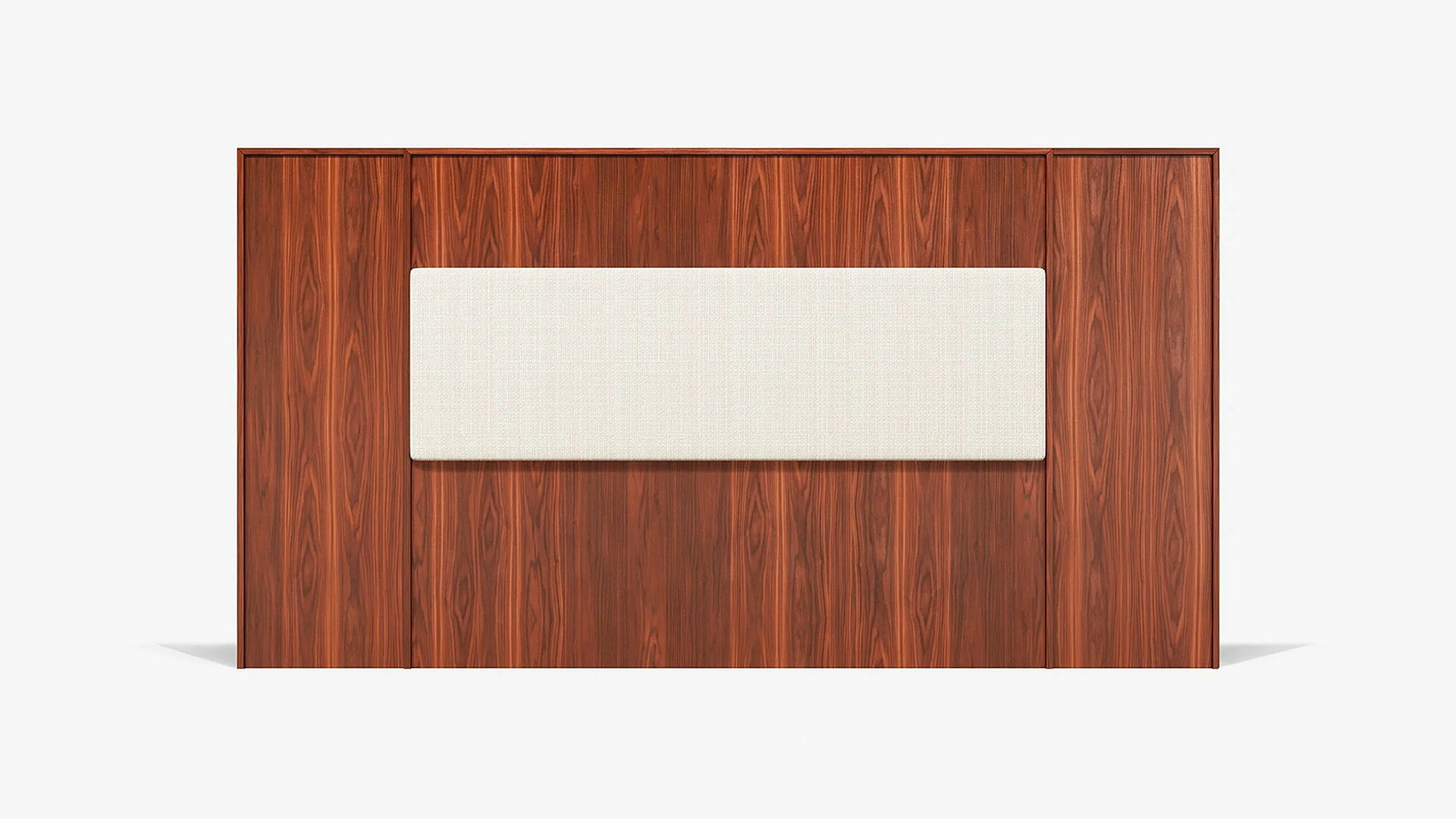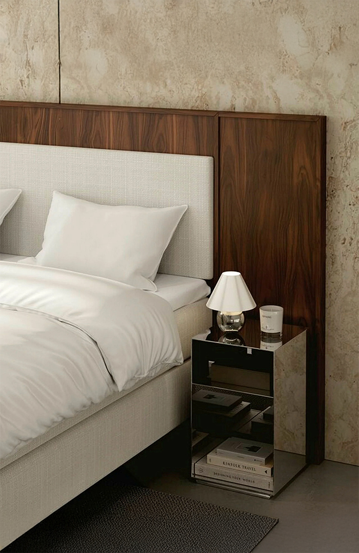 Zagłówek z forniru orzechowego o wyraźnym rysunku usłojenia naturalnego drewna i czystych liniach. Połączony z miękkim tapicerowanym oparciem, którego materiał obiciowy można wybrać spośród ekskluzywnych tkanin Carpe Diem Beds w wielu kolorach. Jest ręcznie wytwarzany w Szwecji i dostępny w kilku rozmiarach.