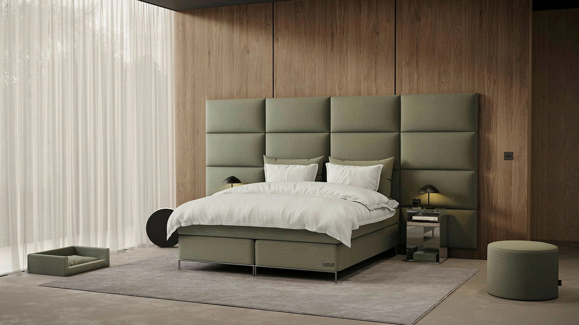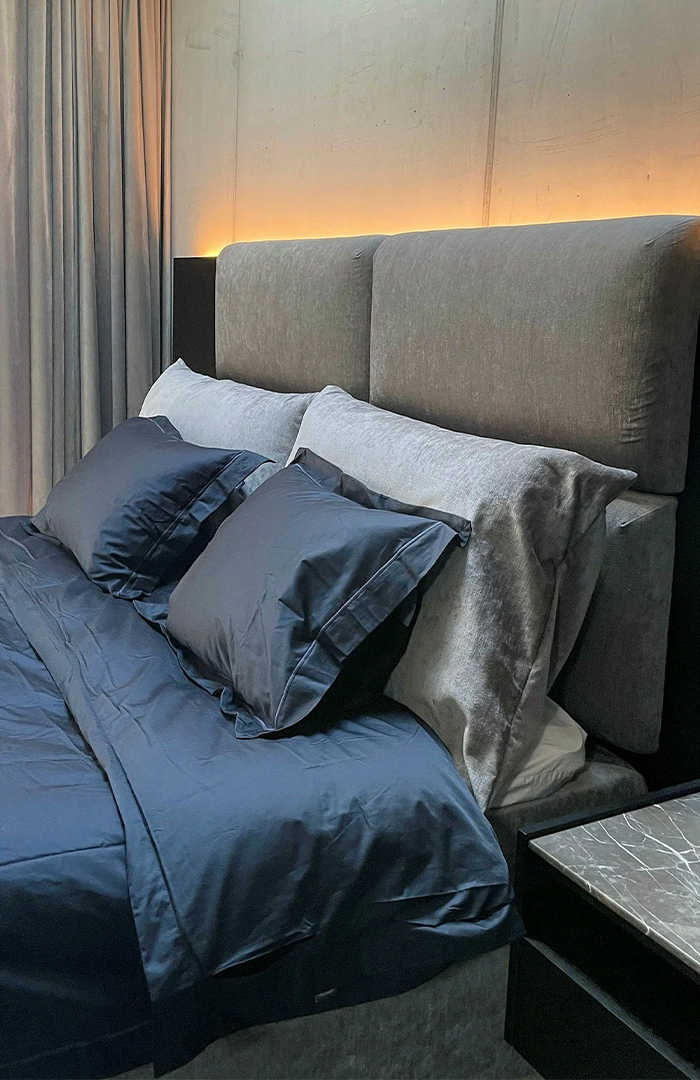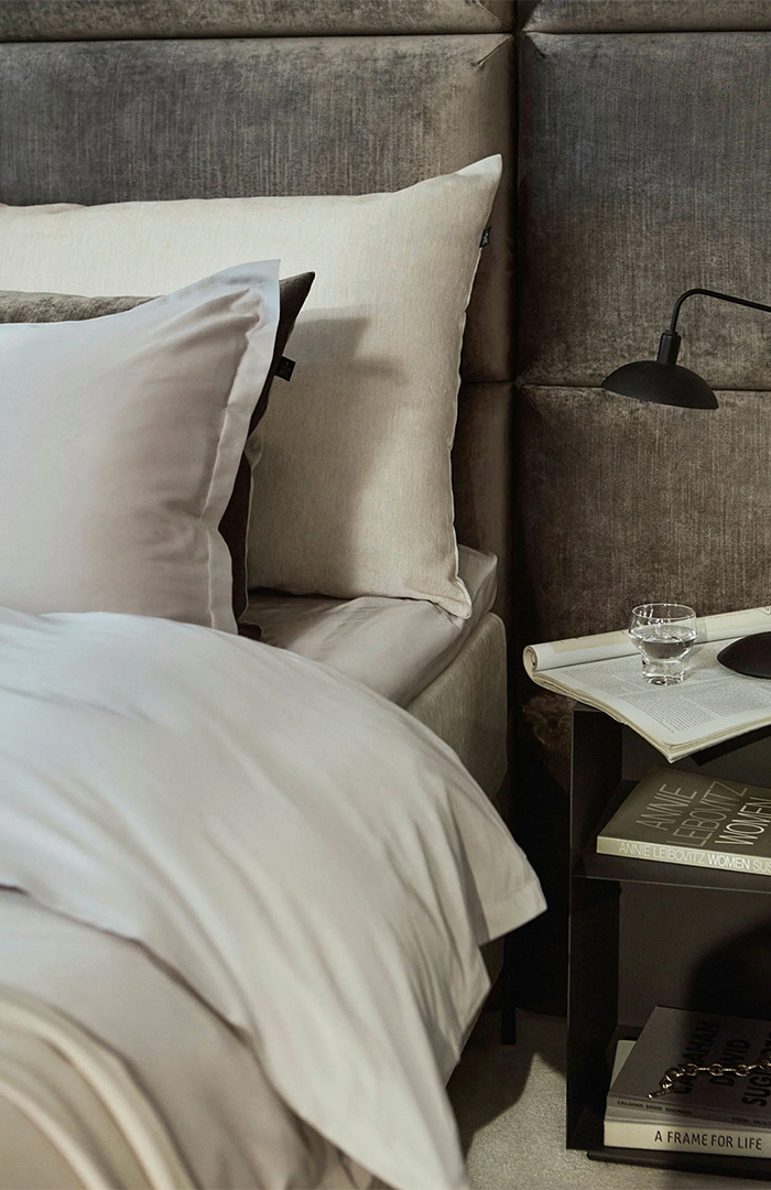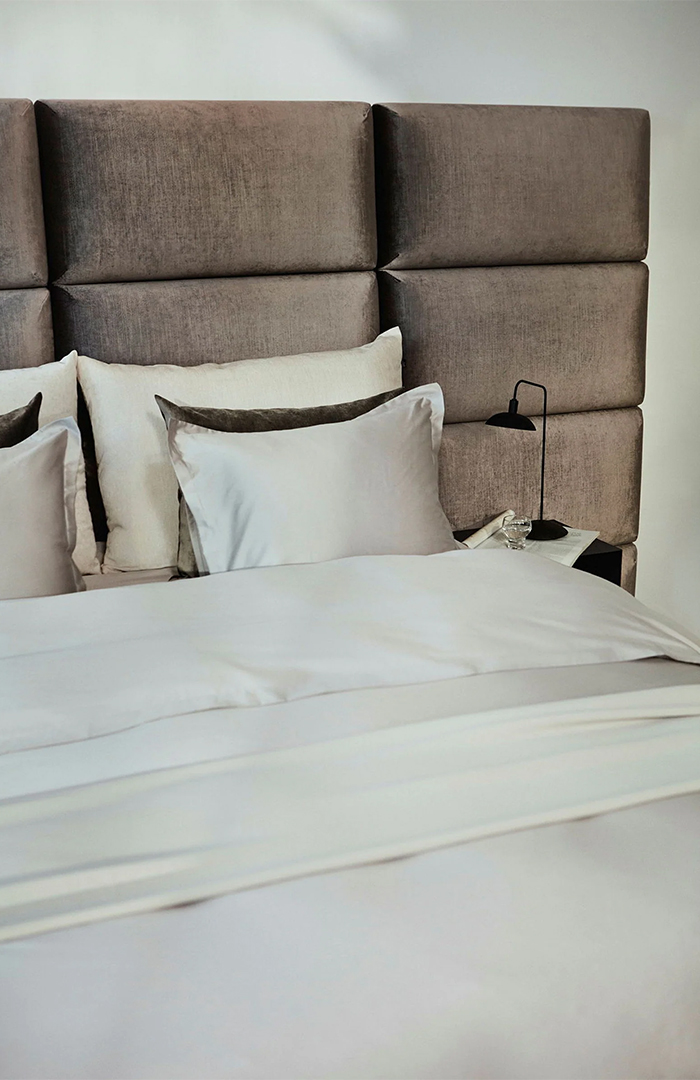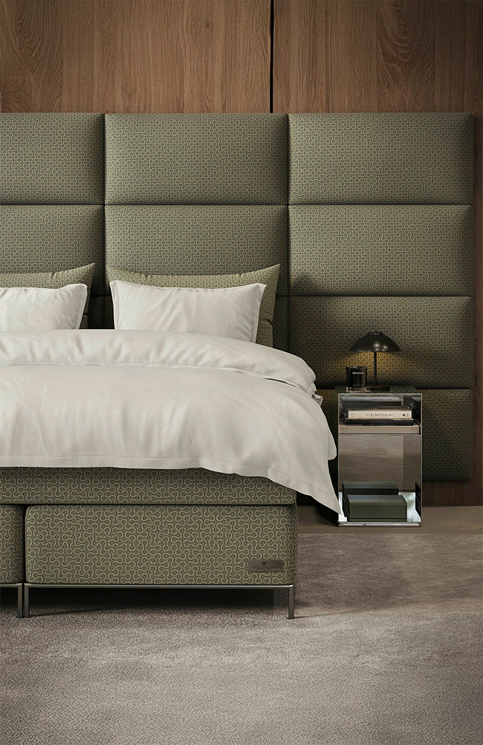 Wezgłowie łóżka składające się z eleganckich, montowanych na ścianie modułów. Jest dostępne w kilku rozmiarach. Można wybierać spośród 44 różnych tkanin obiciowych. Będzie efektownie prezentować się w jednolitej kolorystyce, ale równie dobrze można nadać mu niepowtarzalny wygląd, łącząc różne tkaniny.