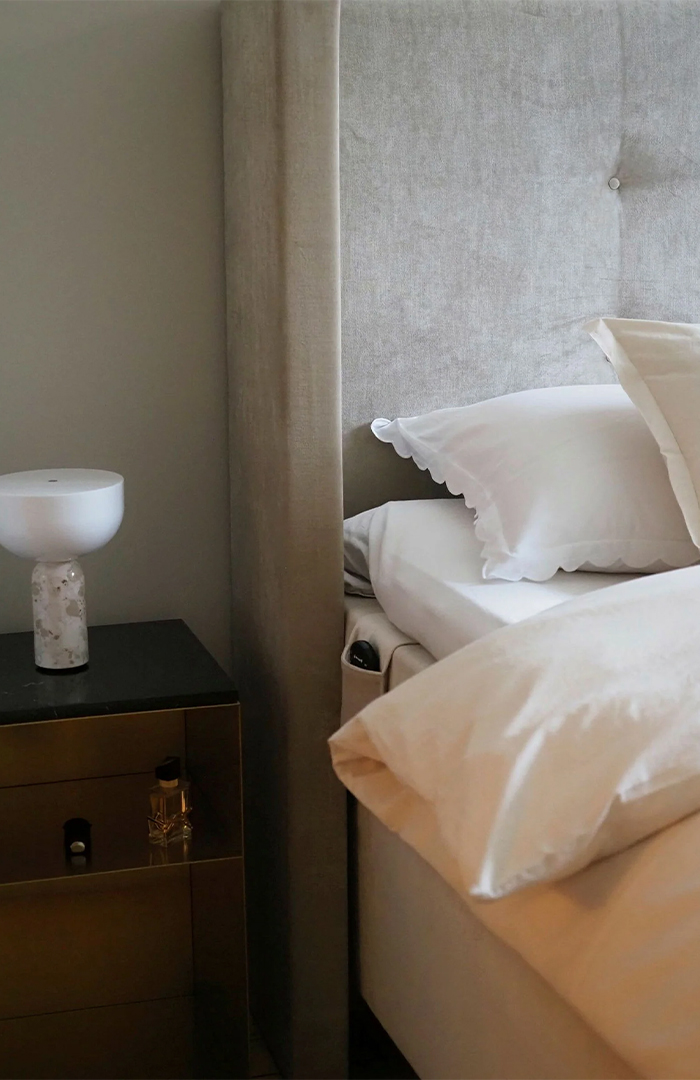 Majestatyczne wezgłowie łóżka o nowoczesnym wzornictwie z subtelnymi guzikami i wystającymi panelami bocznymi, które elegancko oprawiają łóżko. Dzięki imponującej wysokości 185 cm Tornö łączy elegancki szwedzki design z królewskim urokiem. Materiał obiciowy można wybrać spośród 44 wariantów tkanin tapicerskich Carpe Diem Beds.